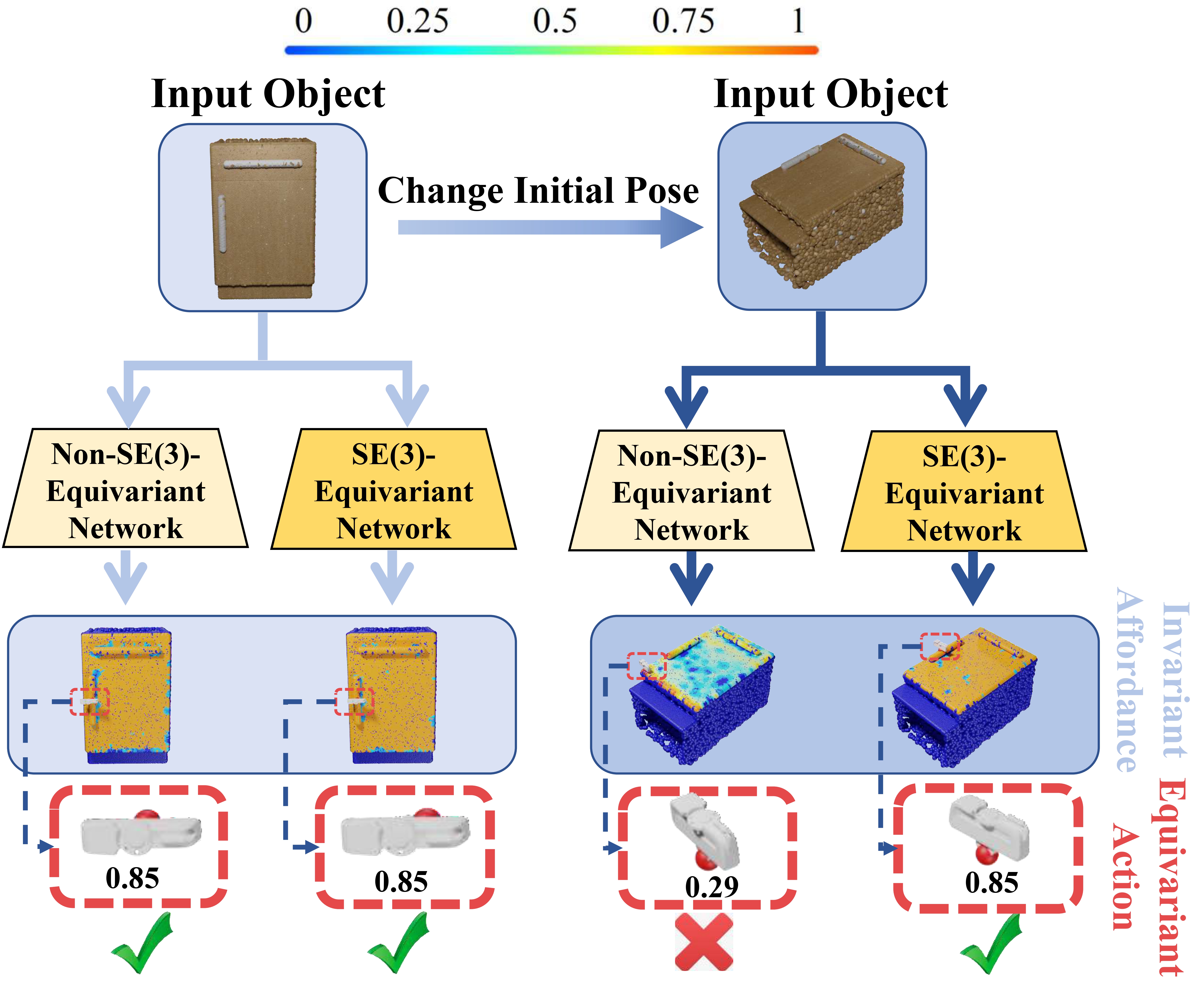 We propose EqvAfford framework, with novel designs to guarantee the SE(3) equivariance in point-level affordance learning for downstream robotic manipulation.